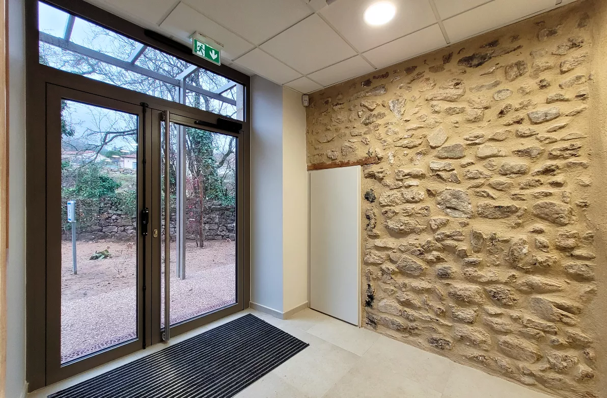Le projet met en valeur son caractère patrimonial, avec la mise en évidence des pierres existantes et la reprise de la charpente, renforcée afin de permettre l’installation de panneaux photovoltaïques. Profitant de la pente naturelle du terrain, la salle associative prend place au niveau semi-enterré, tandis que les bureaux de la mairie s’organisent au rez-de-chaussée, offrant un équipement fonctionnel et ancré dans son site.